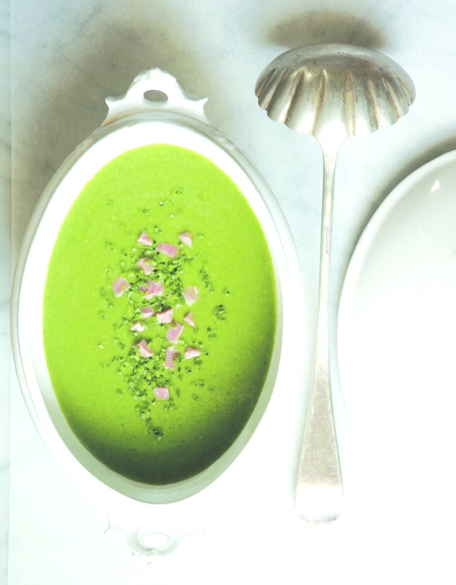 Puréed soups cry out for embellishment. We favor heavy cream, whipped or not; sour cream; snipped chives or minced scallions; or a drizzle of melted butter or olive oil to add more flavor. This minty pea soup from our cookbook “Canal House ” is topped with finely diced ham and lots of chives.