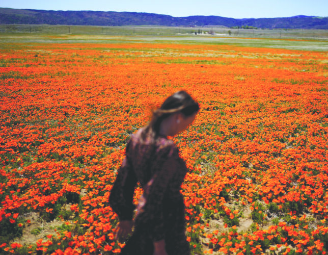 Elena Ivanov, visiting from San Jose, Calif., walks across a field covered with blooming poppies near the Antelope Valley California Poppy Reserve in Lancaster, Calif., in March 2022. (AP file photo)