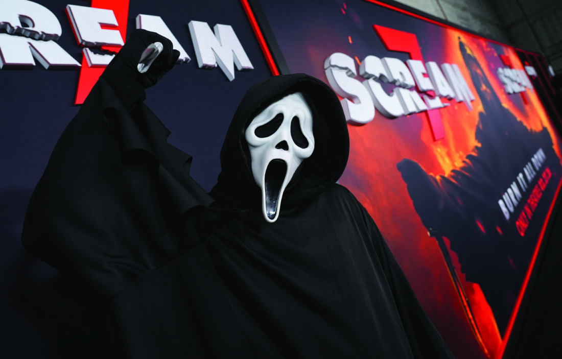 An actor portraying "Ghostface," the masked killer of the "Scream" franchise, strikes a murderous pose at the premiere of "Scream 7" on Feb. 25 at Paramount Theatre in Los Angeles. (AP photo)