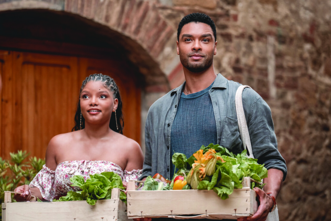This image released by Universal Pictures shows Halle Bailey, left, and Rege-Jean Page in a scene from "You, Me & Tuscany." (Giulia Parmigiani/Universal Pictures via AP)