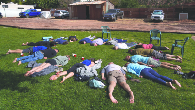 Participants lay face down on the grass during an integration circle at an ayahuasca retreat in Hildale, Utah, on Oct. 15, 2022. (AP file photo)