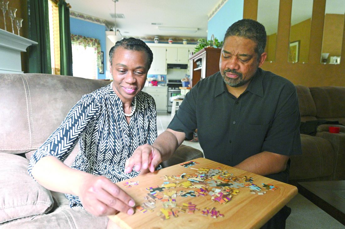 Robert Reid helps his wife, Kim Reid, who was diagnosed with early-onset Alzheimer's, as she puts a puzzle together at their home in Hampton on June 10. (Hyosub Shin/Atlanta Journal-Constitution via AP)