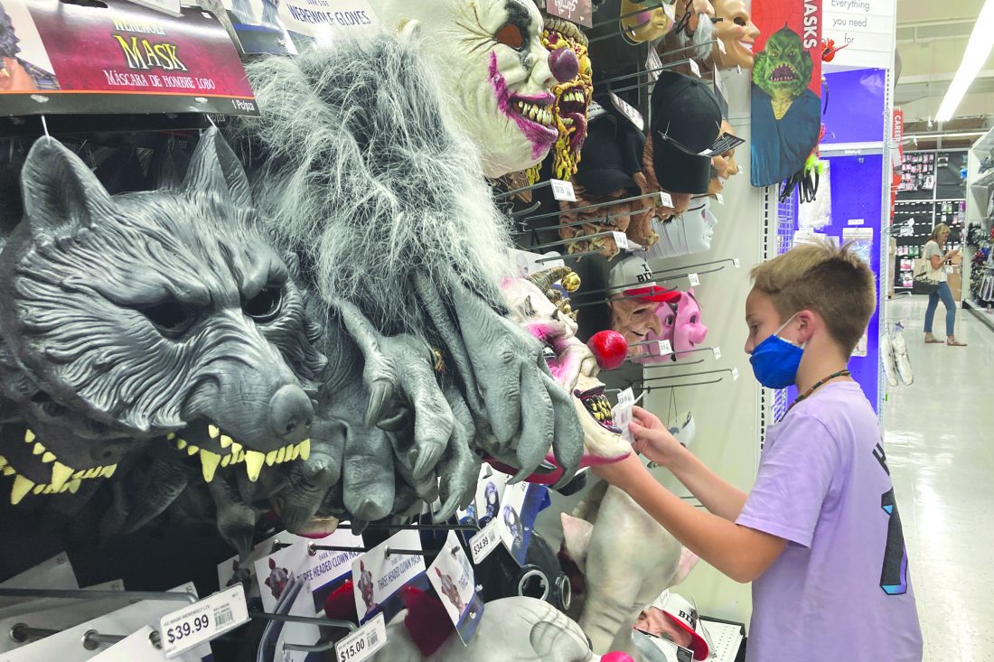 A young customer looks at a Halloween mask at a Party City store Oct. 6 in Miami. Americans continued to spend at a solid clip in September despite rising prices and snarled global supply chains that are limiting the flow of goods. Retail sales rose a seasonally adjusted 0.7% in September from the month before, the U.S. Commerce Department said Friday. (AP photo)