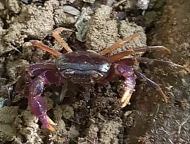 They were also pleasantly surprised to find another long-lost species last seen in 1796 — Afzelius’s crab (Afrithelphusa afzelii)– in Moyamba District Forest. Both share similar color schemes; the females have purplish bodies and orange claws, while the males have pinkish-purple claws and orange legs. Researchers discovered the two species over three weeks of intense searching in difficult-to-access parts of the forest.