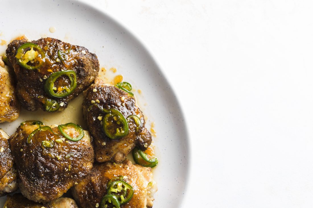 This image released by Milk Street shows a recipe for glazed chicken thighs, seasoned with jalapenos and apricot preserves. A dusting of earthy cumin on the chicken before roasting helps ground the flavors and balance the brighter sweetness of the preserves. (Milk Street via AP)