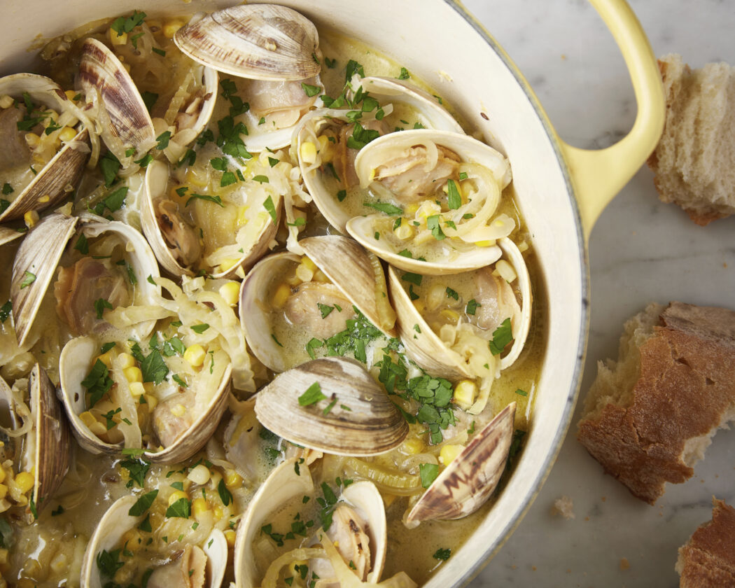 This image released by Milk Street shows a recipe for steamed clams with corn, fennel and crème fraîche. (Milk Street via AP)