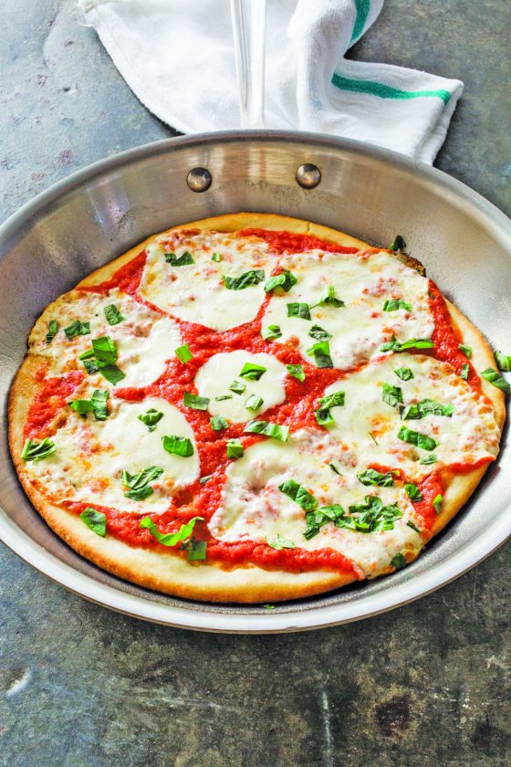 In searching for a foolproof method for cooking pizza whenever the mood struck, we found that making truly great pizza is a breeze in a skillet. Our dough came together quickly in the food processor; after we let it rise, we rolled it thin and then transferred it to a cool oiled skillet, where we topped it with a fast no-cook sauce and slices of fresh mozzarella cheese.