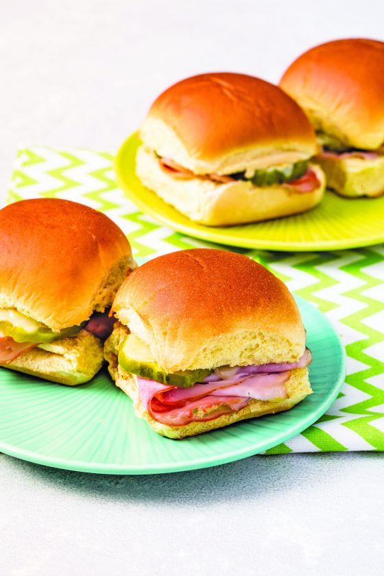Take your ham and cheese sandwich to the next level by turning it into a slider. Fluffy potato dinner rolls are just the right size for a few bites. Heating these small sandwiches in the oven makes the rolls nice and crisp and the cheese melty and gooey. You can also make these sliders in a toaster oven if you have one. To make a whole bunch of sliders for a party, double or triple this recipe (to make 8 or 12 sliders) and heat them all on one rimmed baking sheet in the oven. Follow this recipe with your kids.