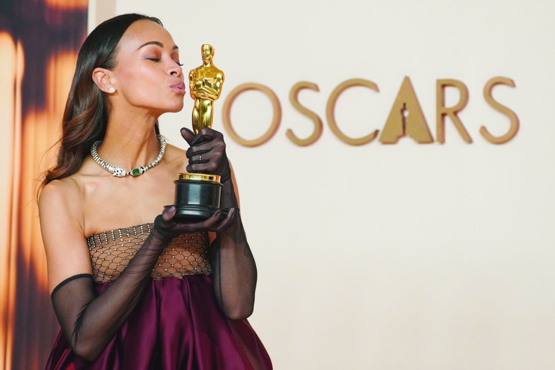 Zoe Saldana, winner of the award for best performance by an actress in a supporting role for "Emilia Perez," poses in the press room at the Oscars on March 2 in Los Angeles. (AP photo)