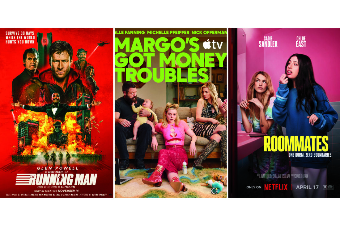 This combination of images show promotional art for the film "The Running Man," lwdt, the series "Margo's Got Money Troubles," center, and the film "Roommates." (Paramount/Apple TV/Netflix via AP)