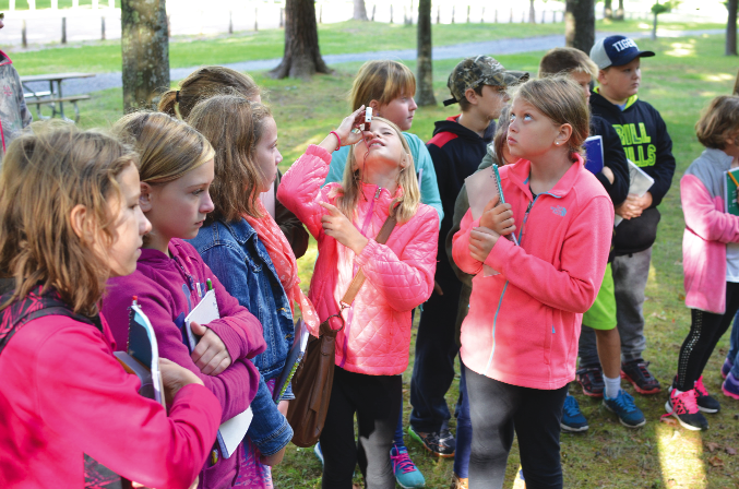Aspen Ridge Elementary School fifth-grader Kendra Scherer tries to determine the height of a tree by gazing through a clinometer, while classmate Athena Kinnunen follows the line of sight. Students Madelyn Reader, Ella Brand and Catherine Bartanen are also pictured, from left. Wheels to the Woods helped fund transportation for the Forestry Field Day outing. (Photo courtesy of the Michigan Department of Natural Resources)