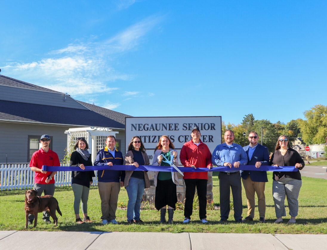 The Lake Superior Community Partnership recently assisted the City of Negaunee with a ribbon cutting ceremony to celebrate the completion of the grant improvements made at the Negaunee Senior Citizens Center and surrounding area. The City of Negaunee was awarded a grant from the Michigan Economic Development Corporation back in 2020.The grant funds allowed the center building to undergo major updating and renovations, including a complete remodel of the kitchen, a fully accessible bathroom, front desk upgrades and a janitorial closet. It also included an overhaul of the exterior facade, including added stone work and new siding, the addition of an automated door entrance on Tobin Street and more. The project also included updating the parking available around the Center, with improvements to a sewer main. The total grant awarded was $542,866, with more than $215,000 going toward renovating the Senior Center building itself. Pictured from the left: Dave Nelson, Negaunee City Planning and Zoning Admin; Zosia Eppensteiner, Marquette County Ambassador; Jeremy Hosking, Gov. Gretchen Whitmer’s Office; Dana LaLonde, City of Negaunee mayor; Kristy Basolo-Malmsten, Negaunee Senior Center director; Dave Kangas, mayor pro tem; Nate Heffron, City of Negaunee manager; Doug Lindblom, U.S. Sen. Gary Peters’ office; and Aubrey Moore, U.S. Sen. Gary Peters’ office.