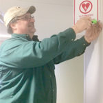 Trades specialist Gary Walimaa installs the AED, or automated external defibrillator, in West Science at Northern Michigan State University. The NMU Surgical Technology Club raised funds to purchase the device after a classmate, who had been diagnosed with an enlarged heart, became ill last semester. (Photo courtesy of NMU)