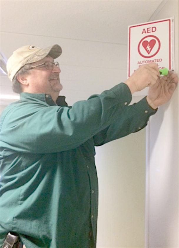 - Trades specialist Gary Walimaa installs the AED, or automated external defibrillator, in West Science at Northern Michigan State University. The NMU Surgical Technology Club raised funds to purchase the device after a classmate, who had been diagnosed with an enlarged heart, became ill last semester. (Photo courtesy of NMU)