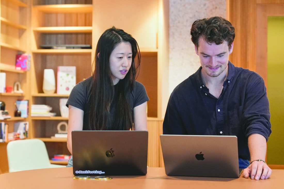 Claude code product manager Cat Wu, left, and Alex Albert, head of Claude relations, work inside Anthropic headquarters in San Francisco on Aug. 27. (AP photo)