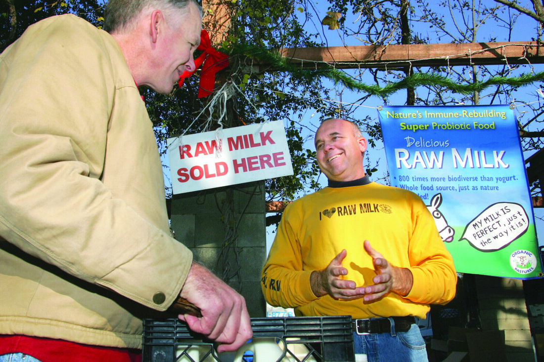 Veterinarian Patrick Smith, left, discusses raw milk with dairyman and producer Mark McAfee at the Farmer's Market in Fresno, Calif., on Dec. 22, 2007. (AP photo)