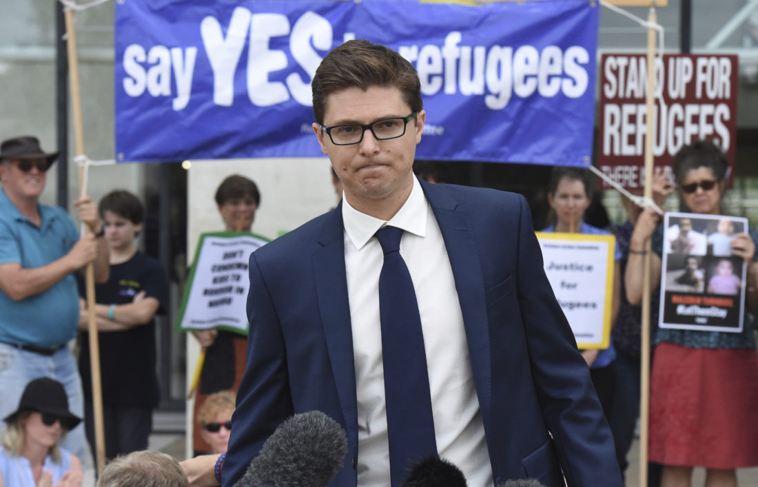 In this Feb. 3, 2016, photo, Daniel Webb from the Human Rights Law Centre speaks outside the High Court of Australia, in Canberra. Webb opposes the Australian government's refugee policies. Australia drew a line in the sand on July 19, 2013, to stem a rising tide of asylum seekers brought by people smugglers on long and treacherous ocean voyages. No refugees who attempted to reach its shores by boat from that date forward would ever be allowed to make Australia their home. (Mick Tsikas/AAP Image via AP)