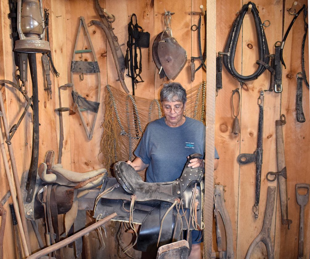 Dianne Castelaz-Chiapusio adds a saddle to the barn display in the new Menominee Range Historical Museum in Iron Mountain. The barn interior was recently completed by James Hartwell, museum foundation vice president. This is among 26 room displays that will be featured in the new museum under construction in the C Ludington Shaft of the Chapin Mine dry building, across from the Cornish Pumping Engine and Mining Museum and the World War II Glider and Military Museum on Kent Street. (Iron Mountain Daily News photo by Terri Castelaz)