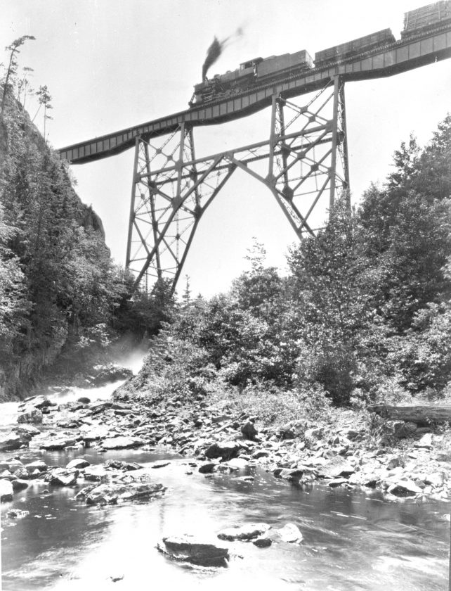 A Lake Superior & Ishpeming train crosses the Dead River trestle in the 1920s. (Photo courtesy of the Superior View Studio, Marquette, www.viewsofthepast.com)