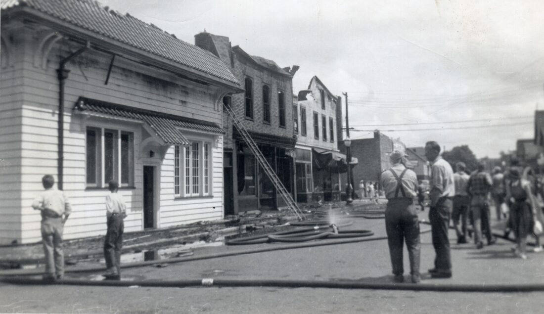 “Also destroyed were the Albert Hooper law office, Bea’s Beauty Shop, operated by Mrs. Beatrice Skoog; apartments occupied by Mr. Steele and Mrs. Lousie C. Hosking and a room rented for storage space to Mr. and Mrs. Gould Lawry who live on Maurice street. These were located upstairs over the Economy Food Market.