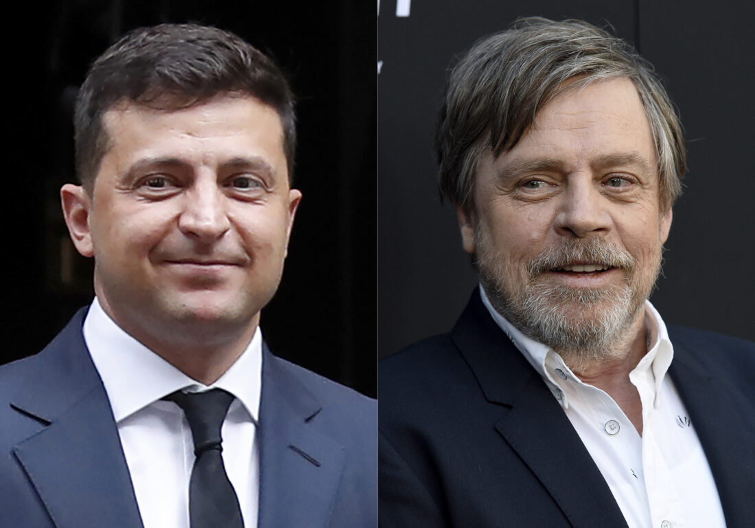 This combination of photos shows Ukraine President Volodymyr Zelensky after a meeting with Britain's Prime Minister Boris Johnson, in London on Oct. 8, 2020, left, and actor Mark Hamill at the premiere of the film Child's Play" in Los Angeles on June 19, 2019. (AP Photo)