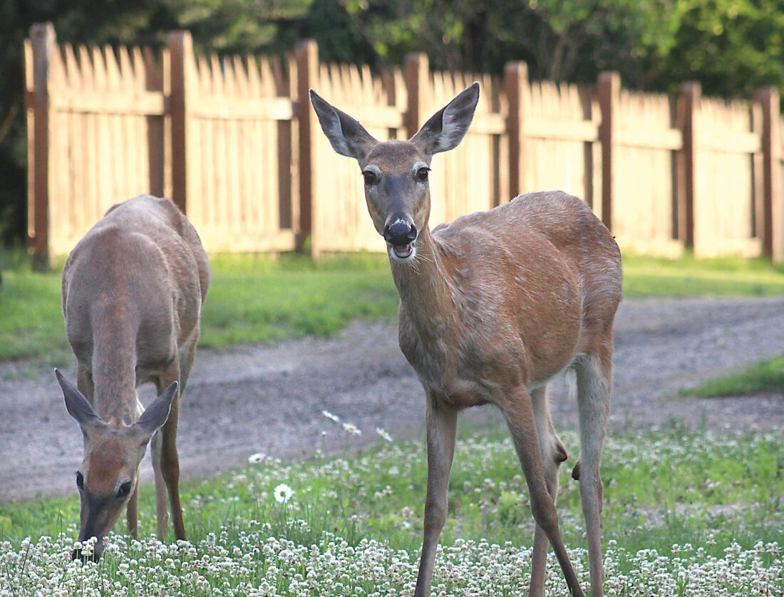 Two does graze in Iron Mountain. (Iron Mountain Daily News file photo)