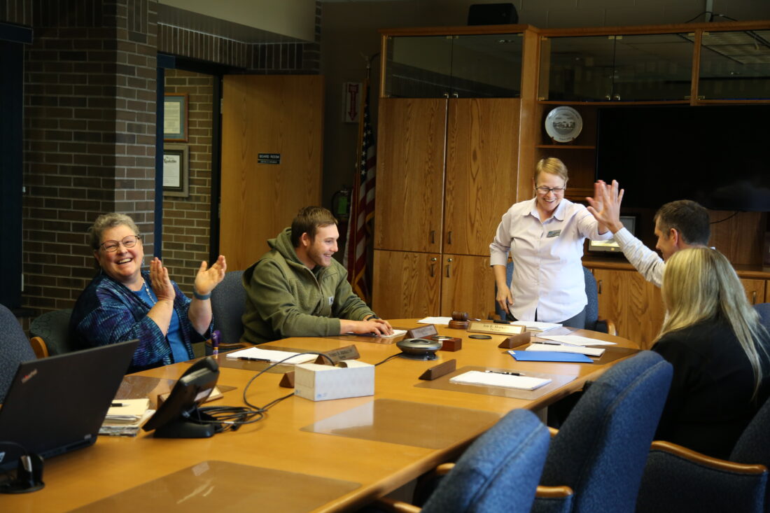 The Bay College Board of Trustees takes a moment to celebrate the completion of the more than six-month search for a new president. The board unanimously voted to approve a contract with Dr. Nerita Hughes, of Minnetonka, Minn. during a noon meeting Tuesday. (Escanaba Daily Press photo)