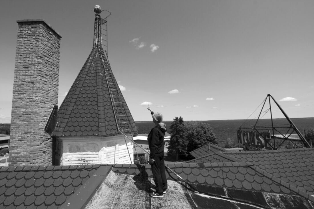 First built in 1864, the now-iconic House of Ludington has accrued several additions, one relocation, a slide deck of owners — and each element, rather than writing over previous editions, has added to the layers of history. The second owner, John Christie, expanded what had been a wood structure; by 1911, he had added a gift shop and ballroom downstairs, more rooms upstairs, and covered the facade with brick. A hidden stairwell strategically placed between windows with views of the sheriff’s department and courthouse — valuable for mobsters during Prohibition in the 1920s — led underground and to other reaches of town via steam tunnels. A cocktail lounge was added in 1937. In the hands of Pat Hayes, what had been the hotel lobby became the King George room with a large fireplace in 1953. A separate entrance heads into a basement where an old barber shop and beauty spa used to be — salon counters, furniture, and even a tanning bed that looks to be from the 1980s are still in the process of being cleared out.