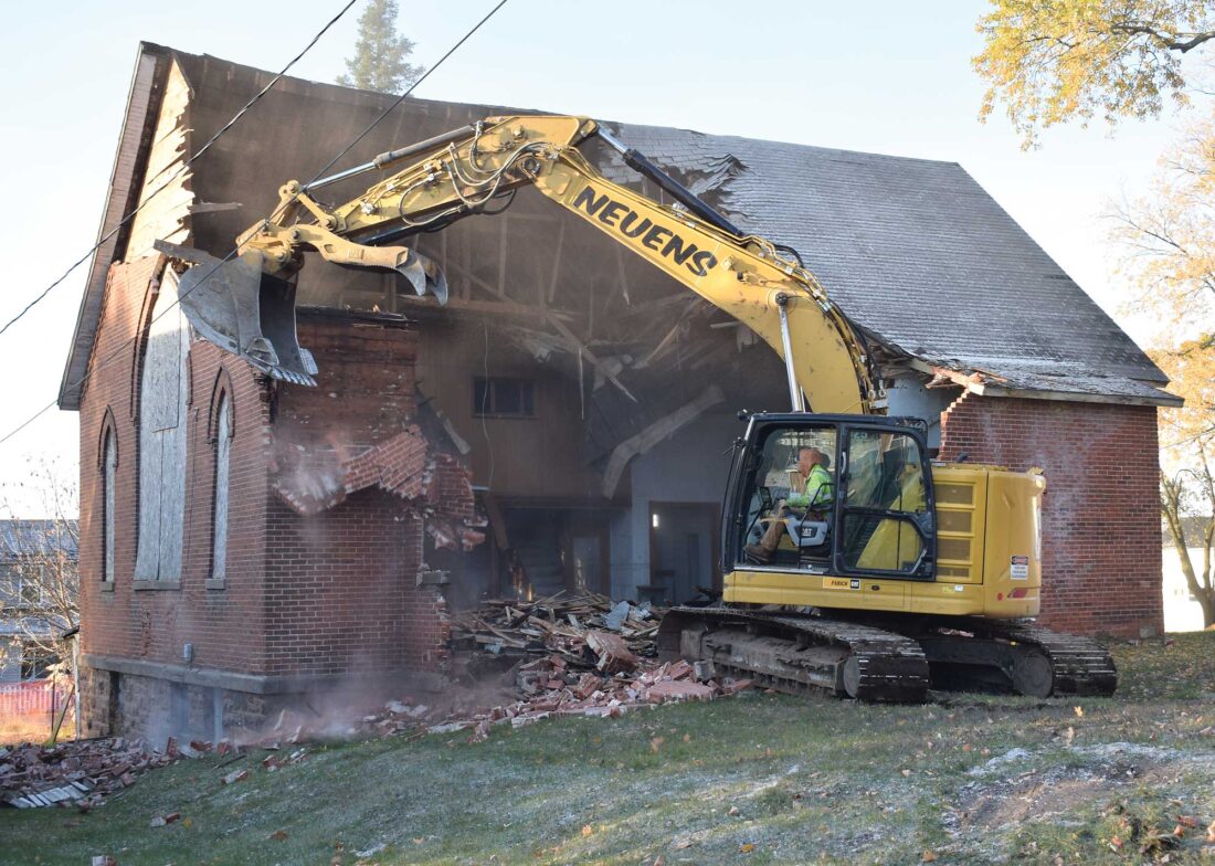 Kirk Martin of Bill Neuens Enterprises of Iron Mountain works to demolish a former church on the corner of West Brown Street and Carpenter Avenue in Iron Mountain, under direction of the Dickinson County Land Bank Authority. The property has been vacant for a number of years. (Iron Mountain Daily News photo)