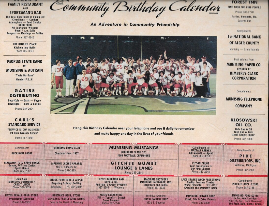 I feel privileged to have documented this historic moment in Munising’s history. One photo shown on our yearly calendar and some great action shots. Notice all the advertisements for businesses sponsoring the calendar and only a few still exist. (Photo courtesy of Mary Jayne Hallifax)