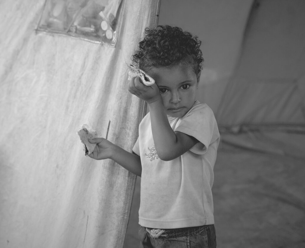 Three-year-old Jourieh Razayneh wipes sweat from her forehead in the summer heat at her family's tent in Gaza City on Tuesday. (AP photo)