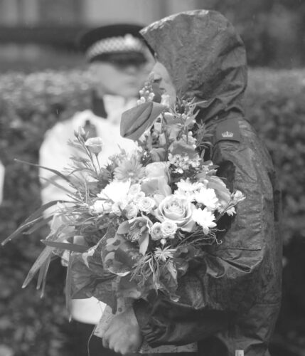 A woman brings flowers as she attends a Friday vigil for the victims of the Thursday attack on the Heaton Park Hebrew Congregation synagogue in Manchester, England. (AP photo)