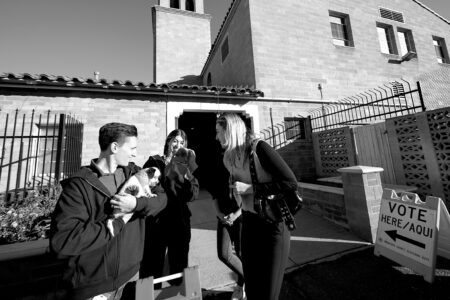Joe Casados, left, holds a dog named Daphne, and Samantha Sasso, holds Carly, as they show the dogs to voters outside the Faith Lutheran Church to ease voter anxiety, on Tuesday, Nov. 5, 2024, in Phoenix, Ariz. (AP file photo)