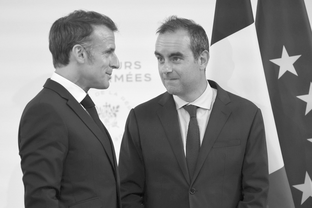Then French Defense minister Sebastien Lecornu, right, and France's President Emmanuel Macron talk at the end of an address by the president to army leaders in Paris on July 13. (AP file photo)