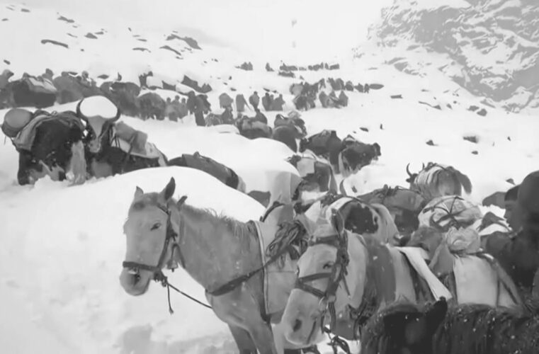 Villagers with their oxen and horses ascend the mountain during rescue efforts to reach hundreds of hikers trapped by heavy snow at tourist campsites on a slope of Mount Everest in Tibet on Sunday. (Lingsuiye via AP)