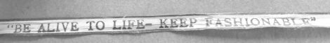 The material, appearing to be a raffia-type ribbon, was in fair condition. The ¼-inch ribbon was off-white with green edges along the 125-inch length of ribbon. The printing on one side of the ribbon in an eight-inch section with a five-inch space between repeats was legible and read: The Paris Fashion–Marquette, Mich.– “BE ALIVE TO LIFE–KEEP FASHIONABLE.”