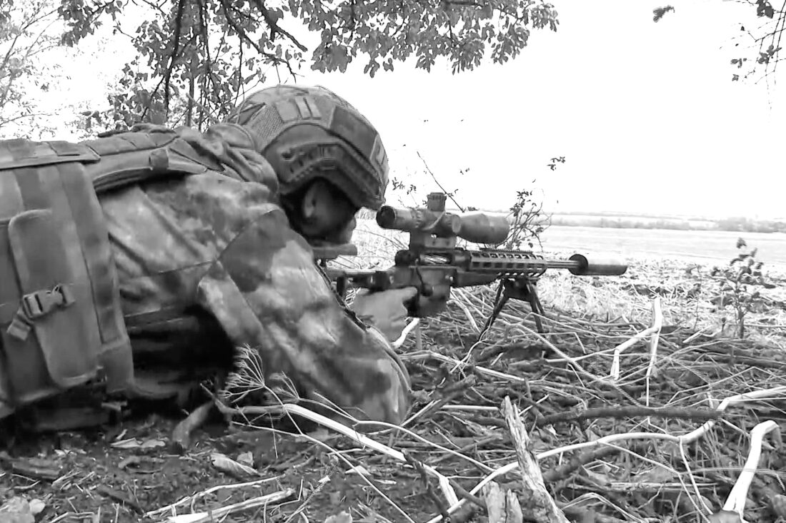 In this photo taken from video distributed by Russian Defense Ministry Press Service on Monday, a Russian sniper fires towards Ukrainian forces from an undisclosed location. (Russian Defense Ministry Press Service via AP)