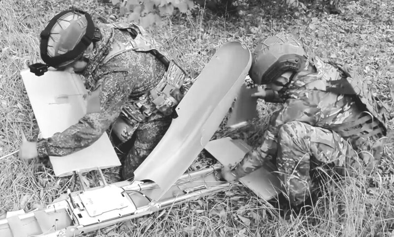 In this image made from video provided by Russian Defense Ministry Press Service on Thursday, Russian soldiers prepare a strike FPV drone aircraft Molniya-2 to fly toward a Ukrainian position in an undisclosed location. (Russian Defense Ministry Press Service via AP)