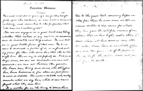 The first draft of Abraham Lincoln's Gettysburg Address is shown on Nov. 2, 1950. The president delivered the address at the dedication of the Gettysburg, Pa., battlefield cemetery on Nov. 19, 1863. Lincoln gave the first draft to his secretary, John Hay, whose children presented it to the Library of Congress in 1916. It is written on one side of two sheets of paper in ink. Most of the concluding sentence is written in pencil. (AP file photo)