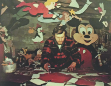 - Palmer resident Dennis Katajamaki works in his basement workshop on his Disney characters for Christmas displays in the 1970s. (Photo courtesy