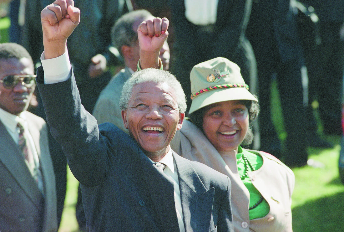 In this July 7, 1991, file photo, taken by South Africa photographer John Parkin, newly-elected African National Congress President Nelson Mandela and his wife, Winnie, greet supporters at an ANC rally. (AP photo/John Parkin, File)