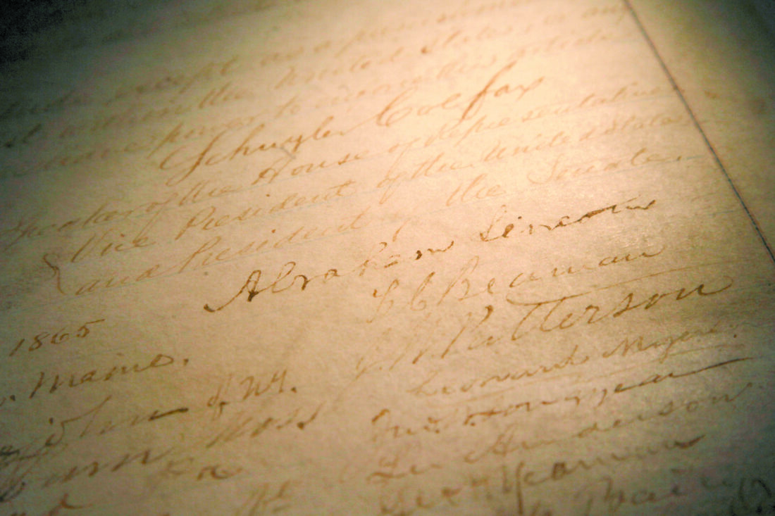The name of President Abraham Lincoln is seen on a rare, restored copy of the 13th Amendment that ended slavery. Slavery in the U.S. officially ended in 1865 with the ratification of the 13th Amendment. (AP file photo)