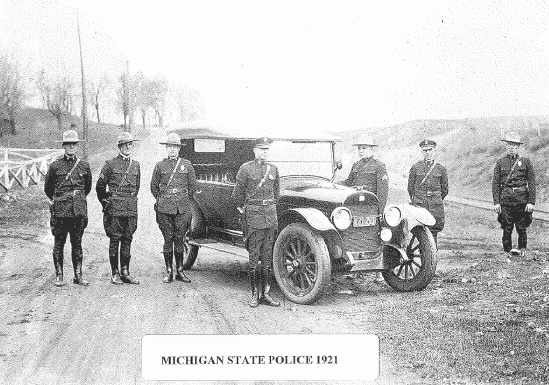 Several Michigan State Police troopers stand with their patrol car on a rural Upper Peninsula road in 1921.