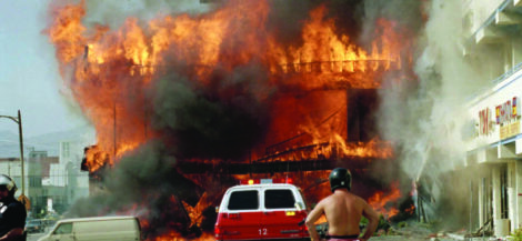 A Korean shopping mall burns in Los Angeles, April 30, 1992 on the second day of rioting in the city following the acquittal of four police officers for the 1991 beating of motorist Rodney King. (AP file photo/Nick Ut)