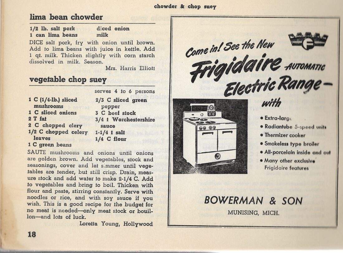 Local cookbooks were frequently sponsored through ads; this one being The Northern Home Furnishing (Bowerman and Son) furniture and appliance store. I love the photo of the Frigidaire automatic electric range. Note the thermal cooker on the stove-top. It was great for making soups and stews and always situated into the back left burner. Of course this was before electric crockpots and microwaves. (Photo courtesy of Mary Jayne Hallifax)