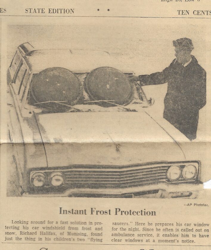 A reminder of a spring snow storm years ago and how my husband protected the windshield of his car. With him being co-owner of the local funeral home and ambulance service he would get called away at a moments notice and what better way to cut down on scrapping the windshield than utilizing the children’s snow saucers. (Photo courtesy of Mary Jayne Hallifax)