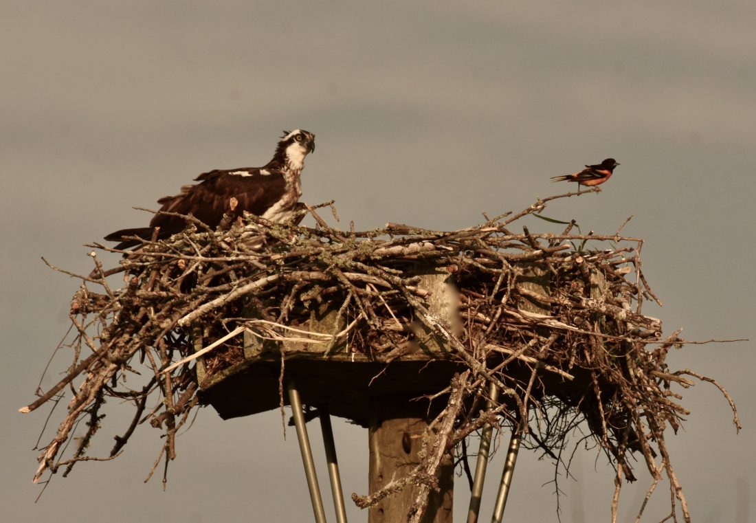 An osprey nest with an osprey and Baltimore oriole is shown. (Scot Stewart photo)