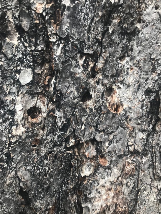 This is maple tree bark, up close and personal in all its majestic grayness. It looks like woodpeckers have gotten up close and personal as well, judging from the holes. (Journal photo by Christie Mastric)