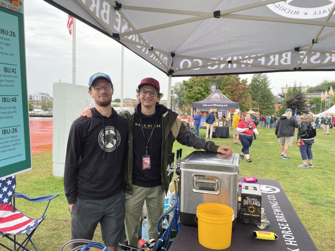 Bottom left: Two brewers from downstates’ Dark Horse Brewery prepare for festival patrons. From left, Cameron Osberger and Charles Osberger. Bottom right a Beerfest cup with one of hundreds of brews offered at the festivalis shown. (Journal photos by Randy Crouch)