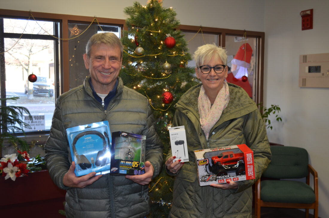 Mike and Linda St. Arnauld of Marquette drop off gifts for older children collected by the Marquette Elks Club for The Mining Journal’s Cheer Club. The club, which kicked off on Nov. 25, collects unwrapped toys and gifts to be donated to local children and families in need during the holiday season. Gifts are distributed to local families through St. Vincent de Paul and The Salvation Army of Marquette County. Gifts can be dropped off at The Mining Journal office in downtown Marquette; St. Vincent de Paul in Marquette; Range Bank locations in Marquette, Harvey and Negaunee; the Marquette Salvation Army; and Ace Hardware in Gwinn. Journal staff members are available to take photos of Cheer Club donors who drop off items at The Mining Journal office from 8 a.m. to 5 p.m. Monday through Friday. The Mining Journal will accept donations up to Dec. 23. However, only items dropped off by Dec. 16 will be available for this season’s gift distribution. (Journal photo by Lisa Bowers)